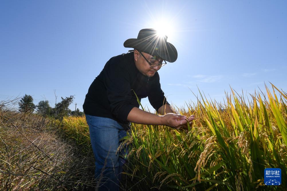 9月23日,在吉林省吉林市永吉县岔路河镇,永吉县鑫丰种植农民专业合作社理事长金天查看水稻长势。