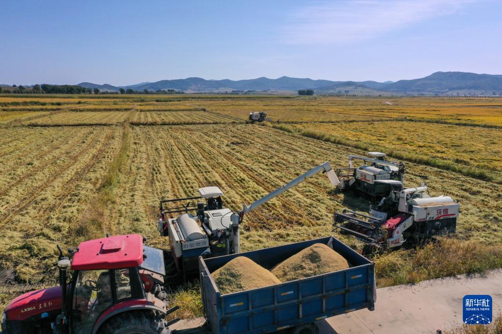 9月23日,在吉林省吉林市永吉县岔路河镇,永吉县鑫丰种植农民专业合作社农民驾驶农机收割水稻(无人机照片)。