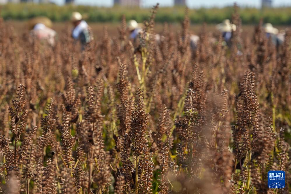 9月23日,黑龙江省佳木斯市桦南县举办庆祝中国农民丰收节活动,工作人员进行紫苏收获展示。