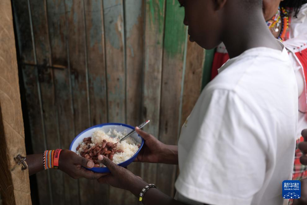 8月31日,在肯尼亚西南部纳罗克郡西纳罗克区艾通镇的女童救助中心,一名女孩从厨房领取午饭。