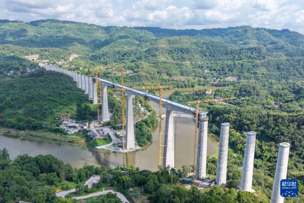 这是9月24日拍摄的渝万高铁五步河双线特大桥建设现场(无人机照片)。