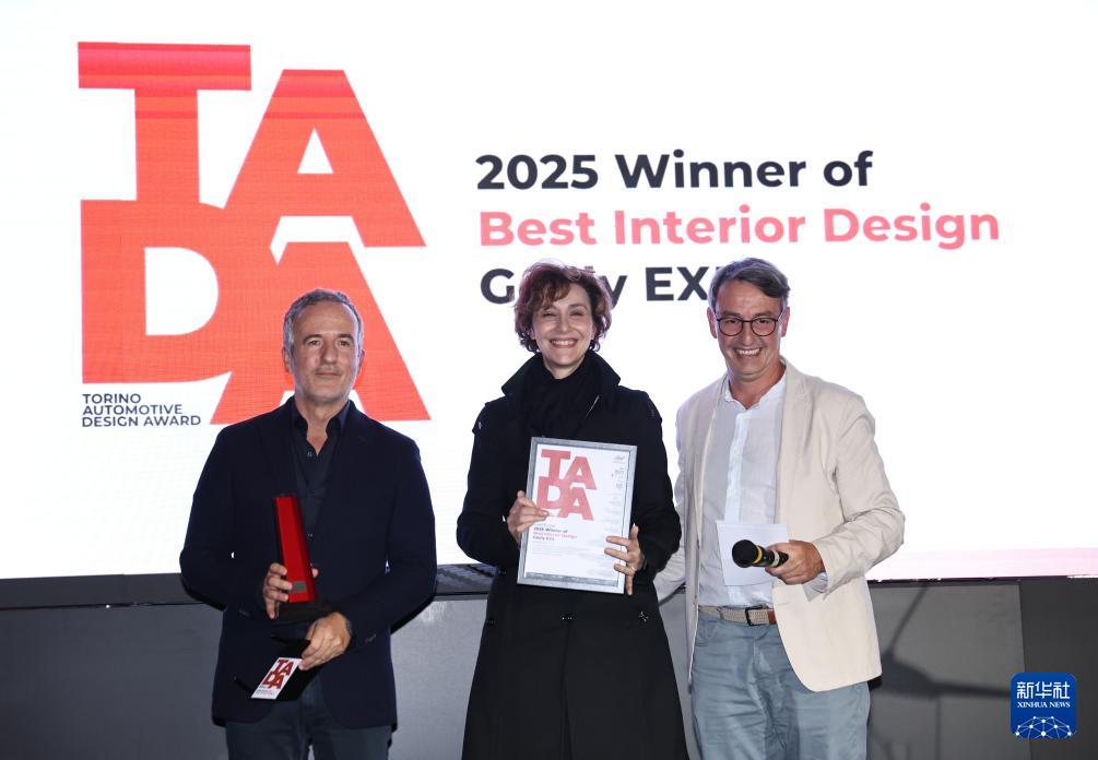 9月26日,在意大利都灵,荣获"都灵汽车设计奖"最佳内饰设计奖的吉利"银河E5"代表领奖。新华社记者 李京 摄