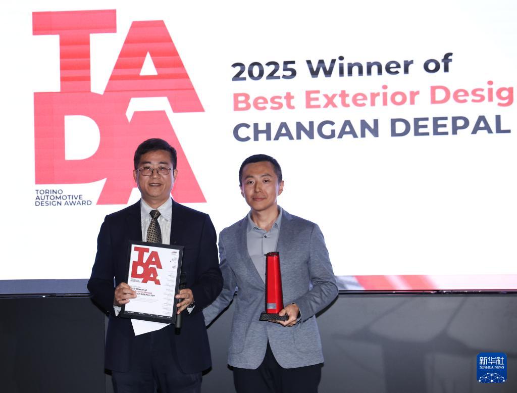9月26日,在意大利都灵,荣获"都灵汽车设计奖"最佳外观设计奖的长安"深蓝S07"代表领奖。新华社记者 李京 摄