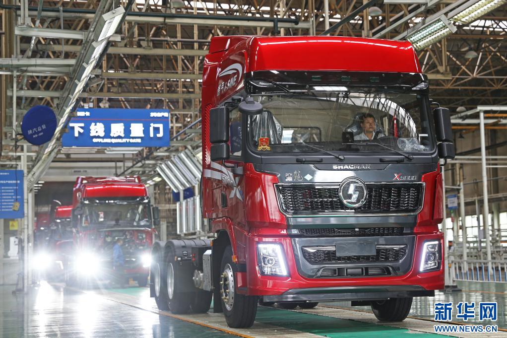 在陕西汽车控股集团有限公司汽车总装配车间,一辆装配完成的汽车下线驶出车间。新华网 王智超摄