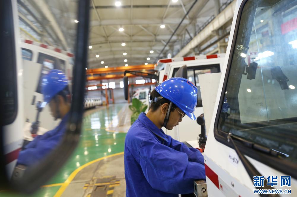 在陕西建设机械股份有限公司装配车间,工人正在进行矿用防爆锂离子蓄电池无轨胶轮车的生产工作。新华网 王智超摄
