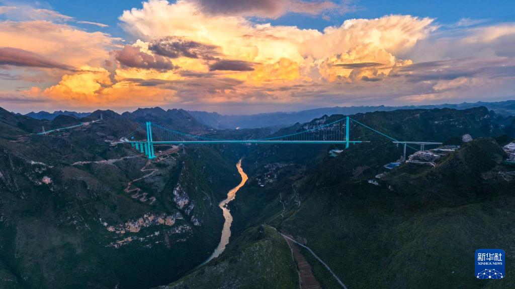 9月28日拍摄的夕阳下的贵州花江峡谷大桥(无人机照片)。