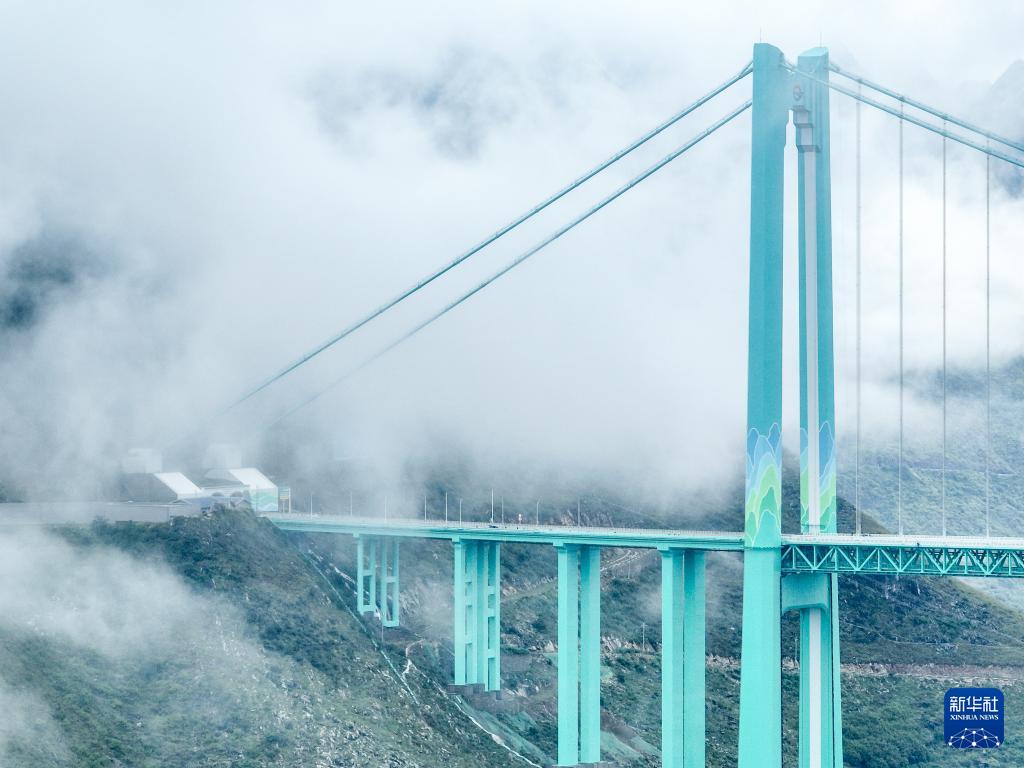 9月26日拍摄的云雾中的贵州花江峡谷大桥(无人机照片)。