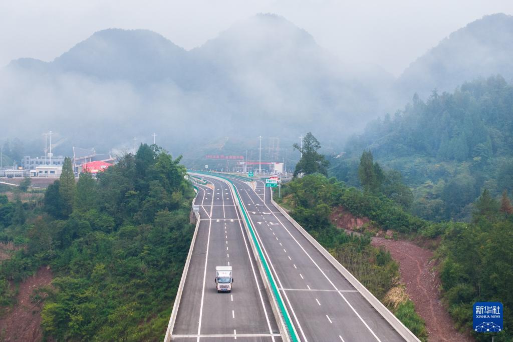 9月29日,一辆汽车行驶在桑龙高速上(无人机照片)。