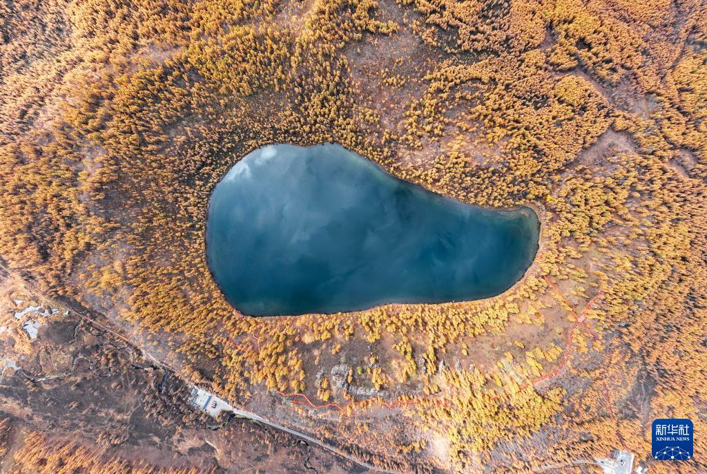 9月29日拍摄的内蒙古阿尔山国家森林公园驼峰岭天池景色(无人机照片)。