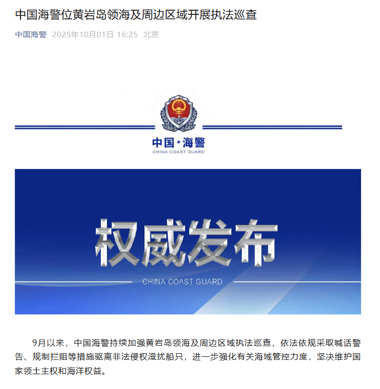 9月以来,中国海警持续加强黄岩岛领海及周边区域执法巡查,依法依规采取喊话警告、规制拦阻等措施驱离非法侵权滋扰船只,进一步强化有关海域管控力度,坚决维护国家领土主权和海洋权益。