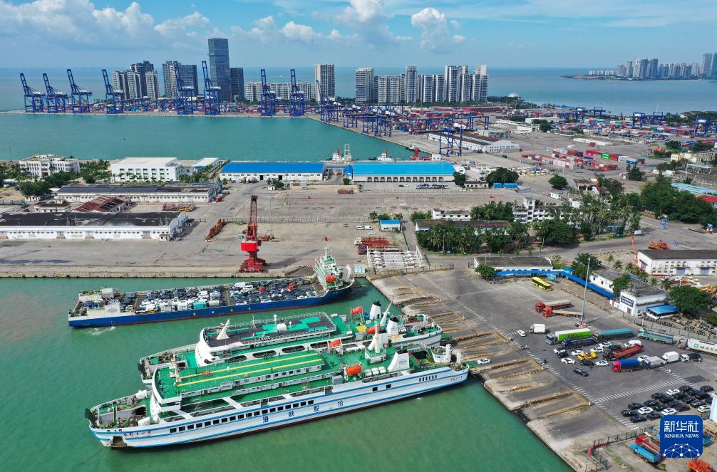 10月4日,在海南省海口市秀英港,客滚船在停运前装卸乘客、车辆(无人机照片)。