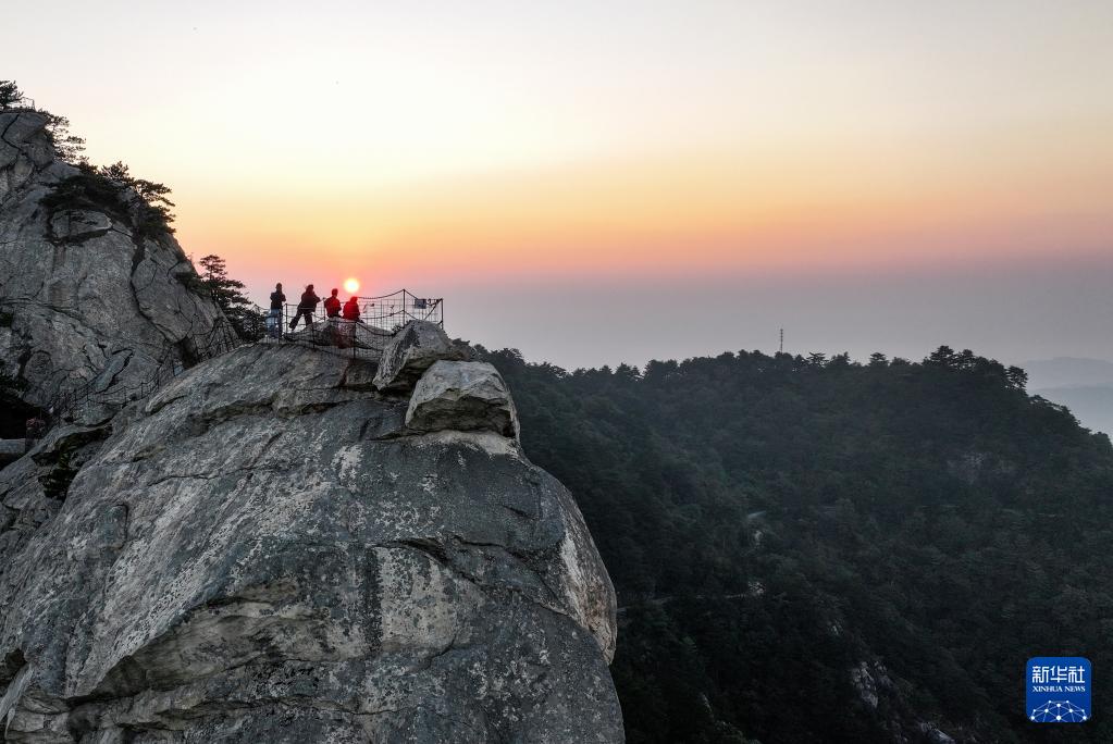 10月9日清晨,几名游客在龟峰山观日出(无人机照片)。