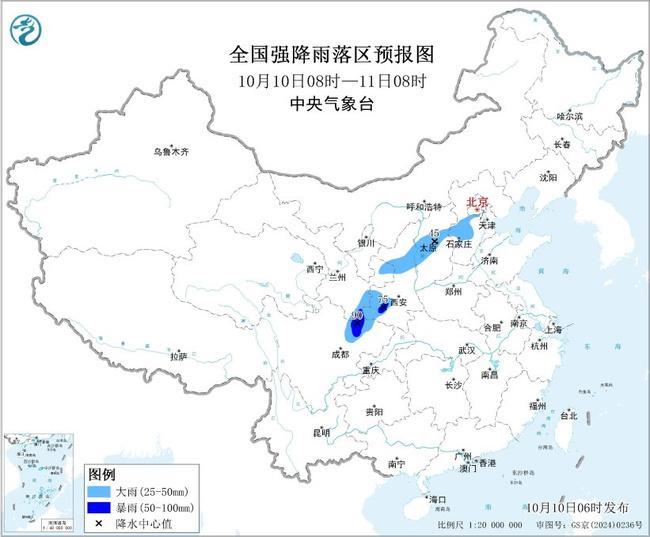 预计,10月10日08时至11日08时,四川盆地西北部、甘肃东部和南部、陕西中部和南部、山西中部、河北中部等地部分地区有大到暴雨(50~90毫米)。上述部分地区伴有短时强降水(最大小时降雨量20~40毫米)。