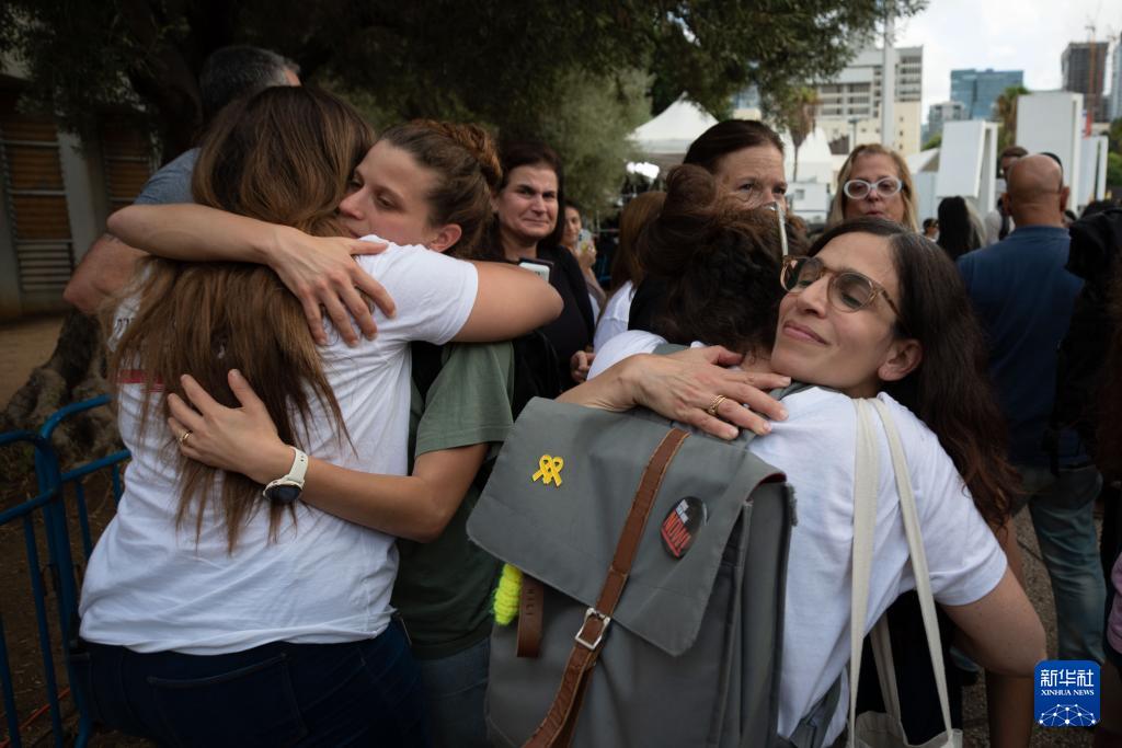 10月9日,在以色列特拉维夫,人们获悉加沙停火协议的消息后相互庆祝,期待被扣押的人员早日获释。新华社记者 陈君清 摄