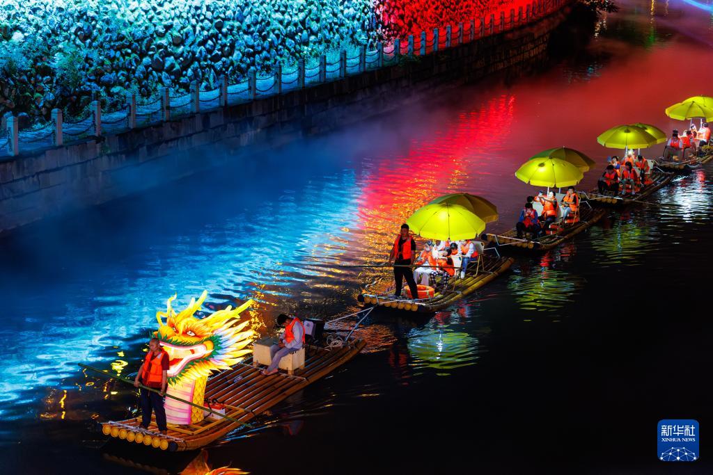 10月6日,游客在福建省长汀县体验"夜游汀江"项目。新华社记者 李昊泽 摄