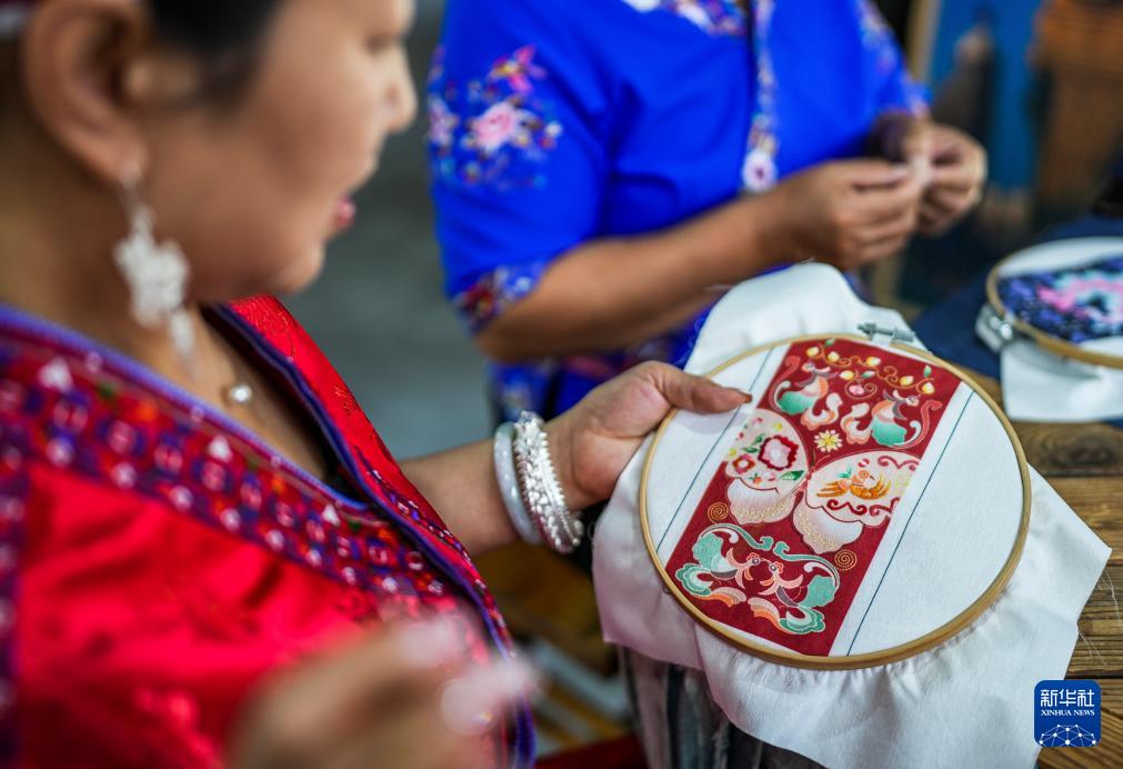 近年来,龙禄颖致力于探索苗绣的创造性转化应用。她投入智能化苗绣生产设备,生产苗家风格的绣品,广泛应用于墙布、挂画、服装等产品。妇女们用自己的双手绣出了一片锦绣天地。