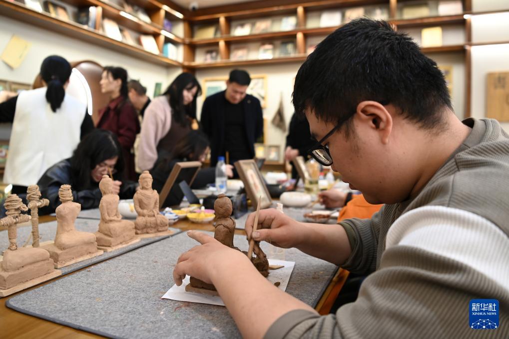 10月11日,游客在敦煌书局体验泥塑制作。