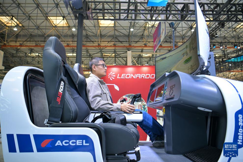 10月14日,工作人员在天津直博会直升机馆内调试模拟飞行体验设备。