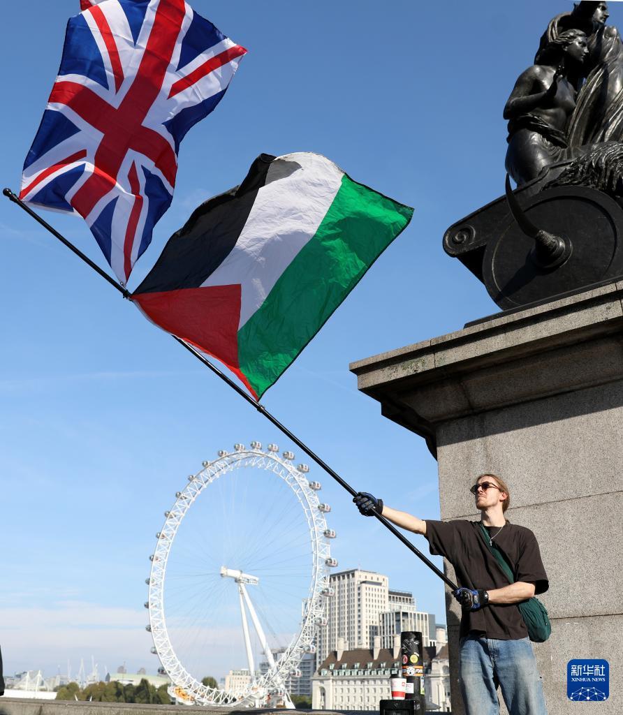 当日,英国民众在伦敦举行游行活动声援巴勒斯坦,呼吁加沙实现持久和平。