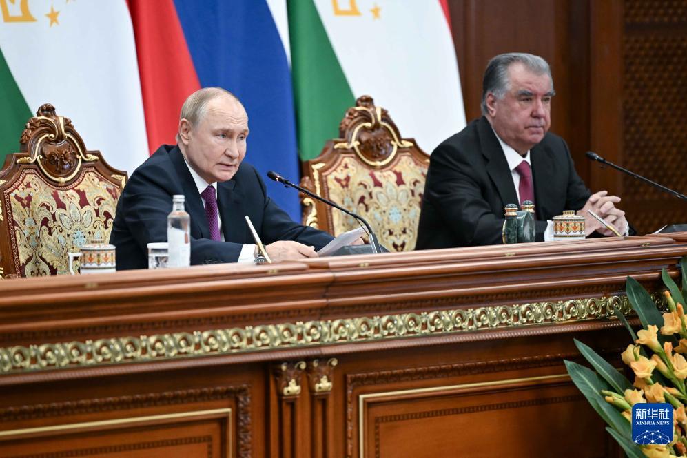 10月9日,在塔吉克斯坦首都杜尚别,俄罗斯总统普京(左)和塔吉克斯坦总统拉赫蒙共同出席联合记者会。