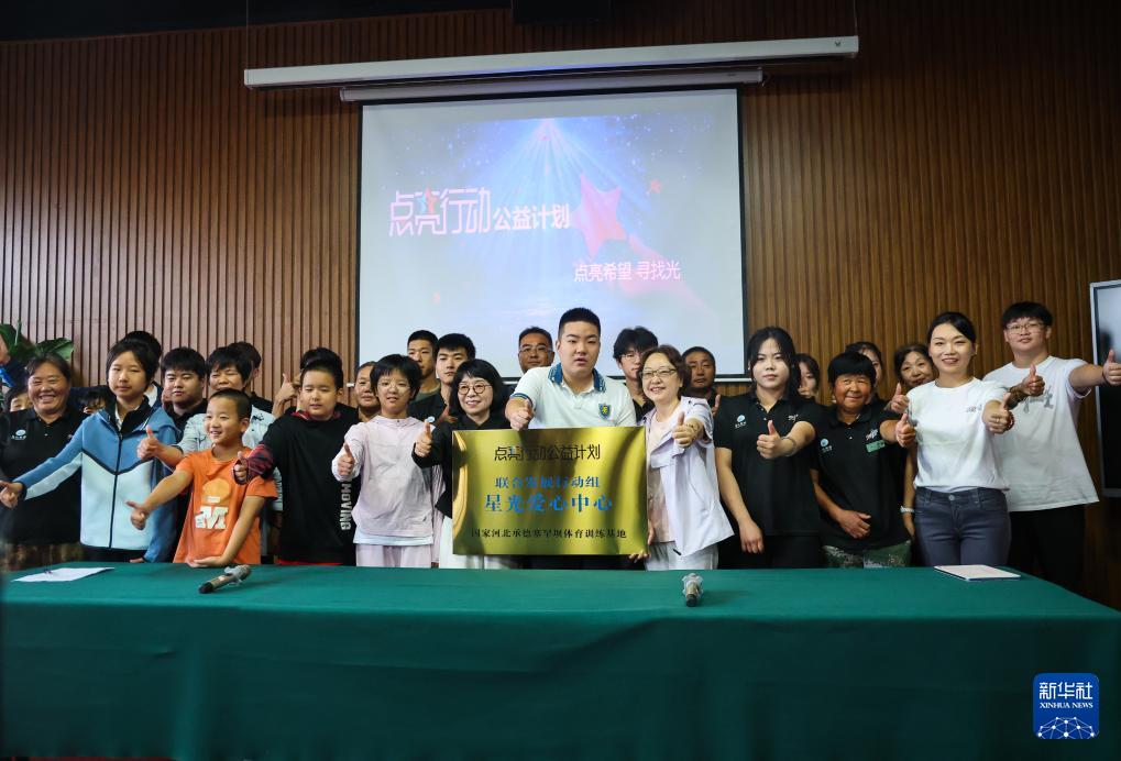 8月18日,王剑书(前排右五)参加"点亮行动公益计划"与国家河北承德体育训练基地的合作仪式。