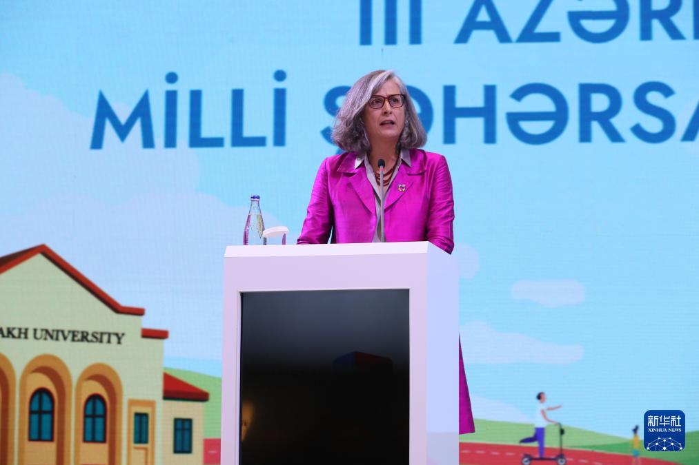 10月15日,联合国副秘书长、联合国人类住区规划署(人居署)执行主任罗斯巴赫在阿塞拜疆汉肯德举行的第三届阿塞拜疆国家城市论坛开幕式上致辞。新华社记者 陈俊锋 摄