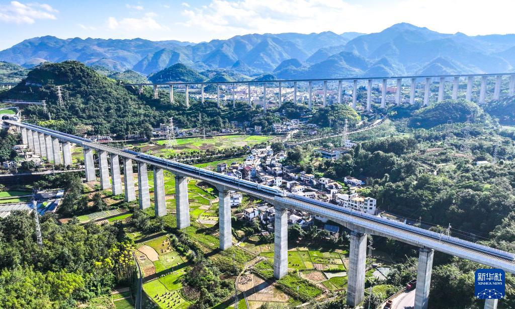 10月17日,运行试验列车经过贵州盘兴高铁三标段清水河镇特大桥(无人机照片)。