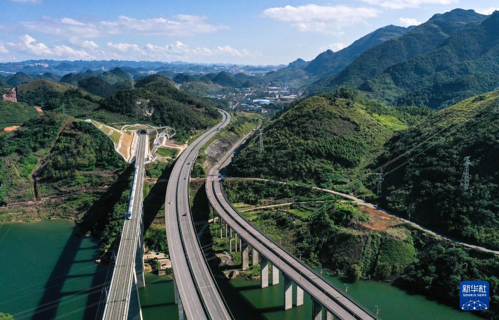 10月17日,运行试验列车经过贵州盘兴高铁三标段纳怀河特大桥(无人机照片)。