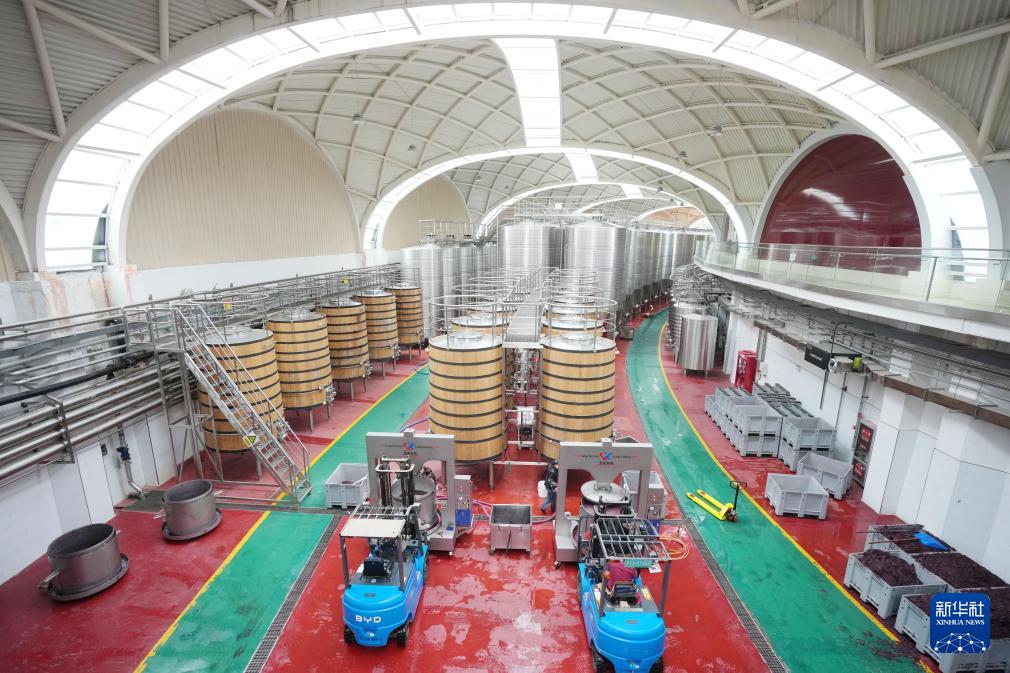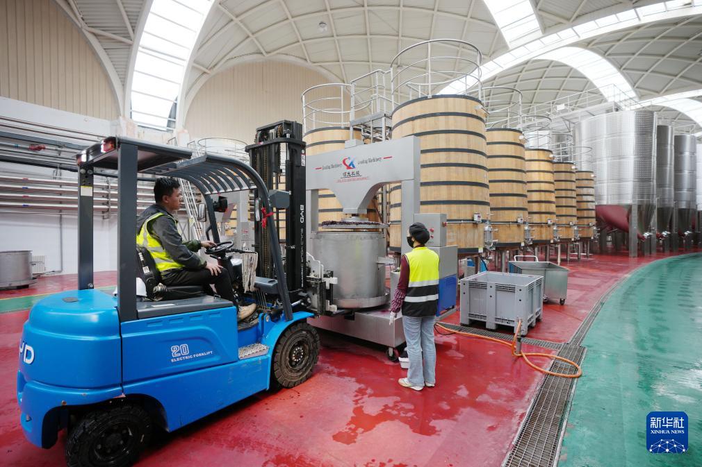 工作人员在银川市永宁县闽宁镇贺兰红酒庄酿酒车间工作(10月14日摄)。