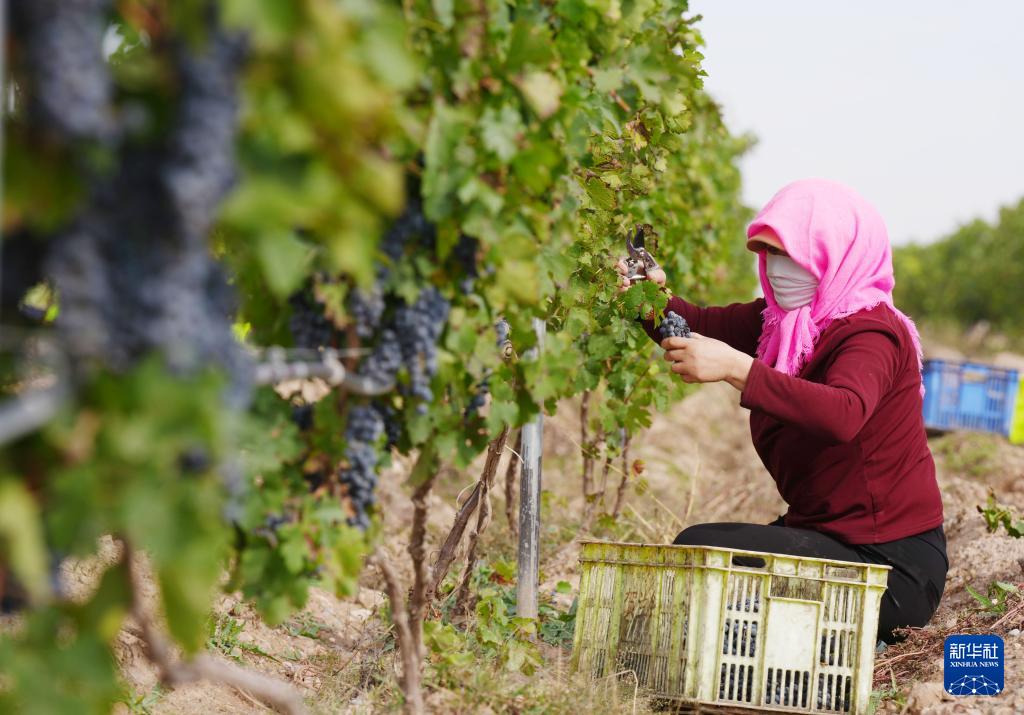 农户在银川市永宁县闽宁镇葡萄地里采摘酿酒葡萄(10月14日摄)。