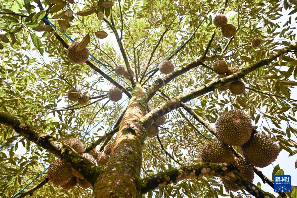 这是10月16日在马来西亚彭亨州劳勿拍摄的一棵榴莲树,树枝上挂满了沉甸甸的黑刺榴莲。