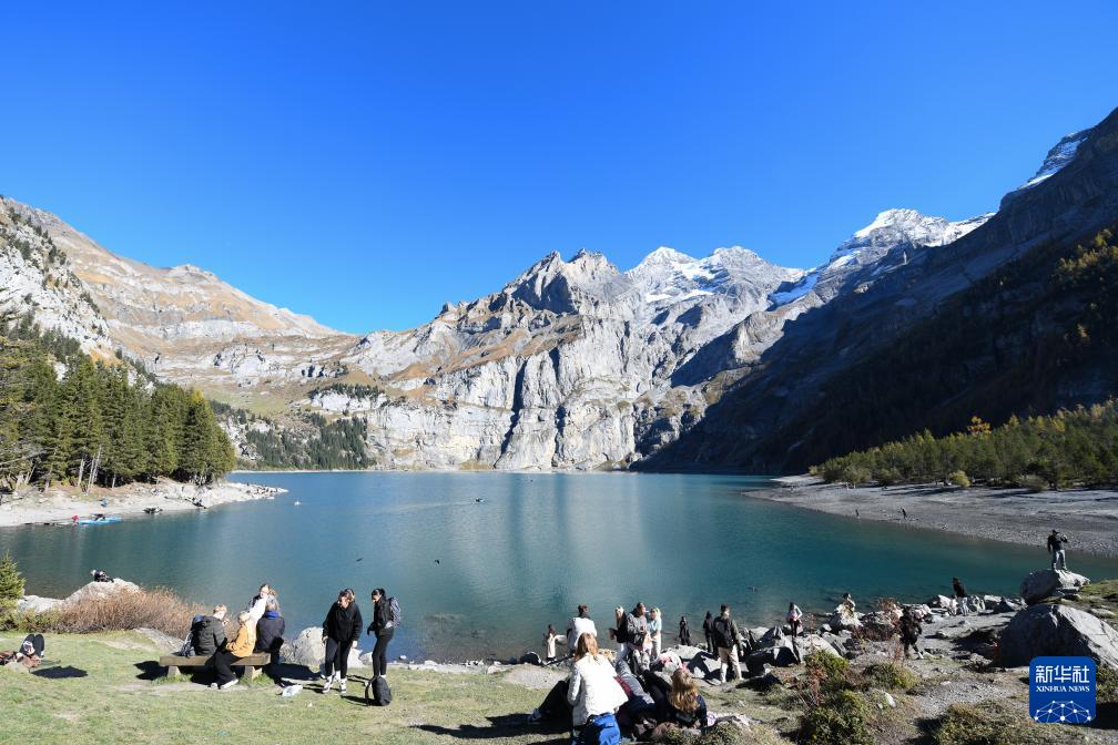 10月18日,人们在瑞士伯尔尼州厄希嫩湖边欣赏秋景。