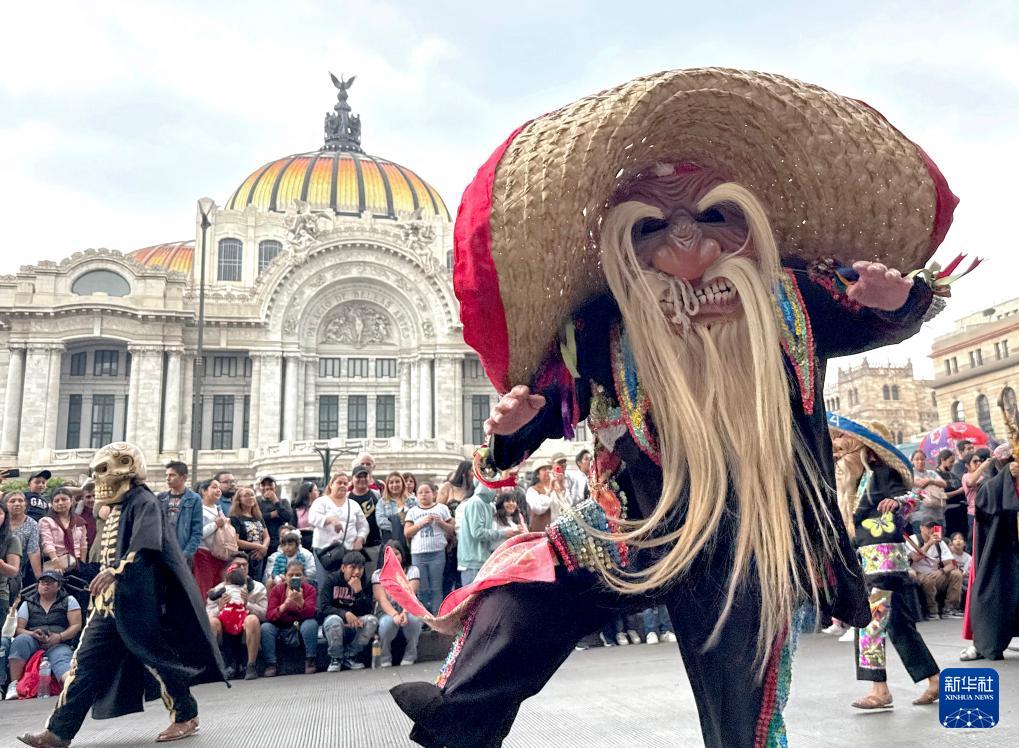 10月18日,在墨西哥首都墨西哥城,人们头戴传统面具载歌载舞参加魔幻动物大游行(手机照片)。