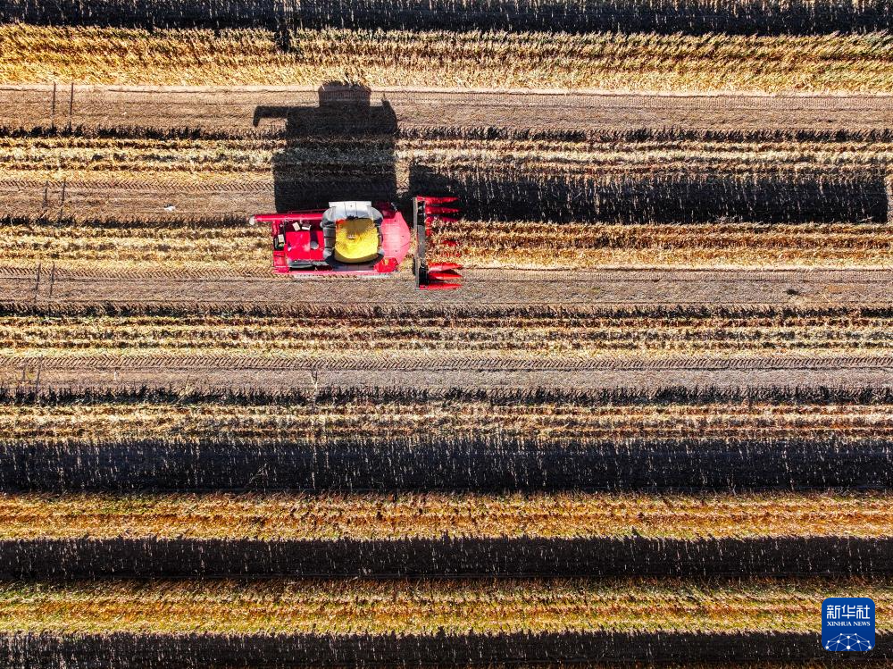 10月18日,在通辽市科尔沁左翼后旗吉尔嘎朗镇,农机手驾驶收割机收割玉米(无人机照片)。