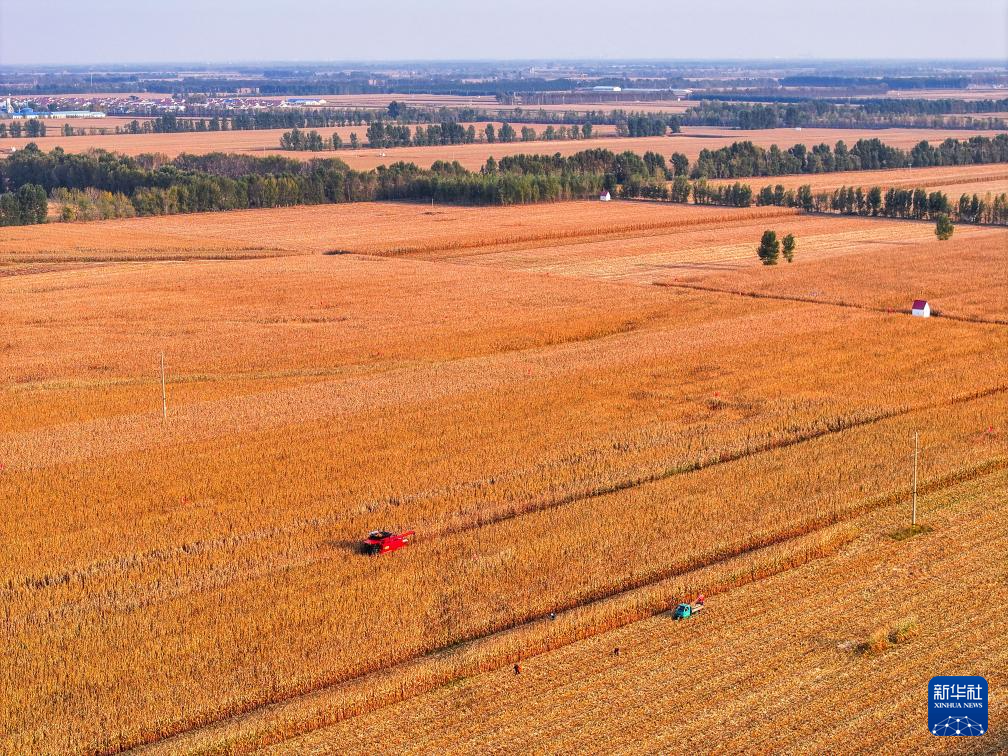 10月14日,在通辽市科尔沁区丰田镇,农机手驾驶收割机收割玉米(无人机照片)。