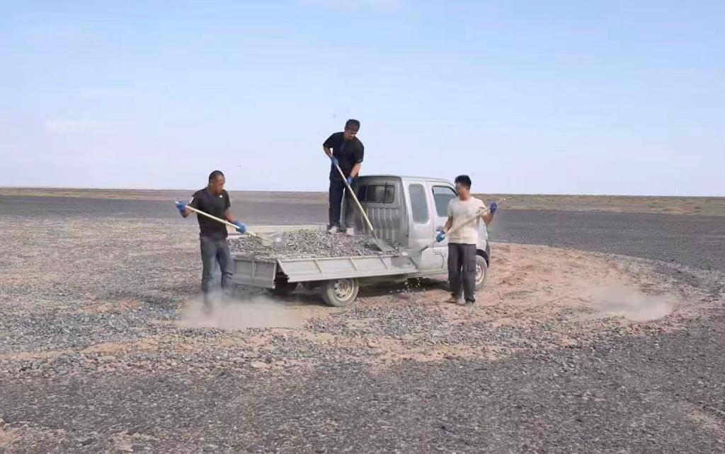 "看到车轮碾过标语那一刻,就像碾在历史的脊梁上。"网络博主陆遥得知标语被破坏后,主动驱车两千多公里,经历六天抵达哈密。他和朋友们拉运20吨砂石,才终于修复这些"疤痕"。