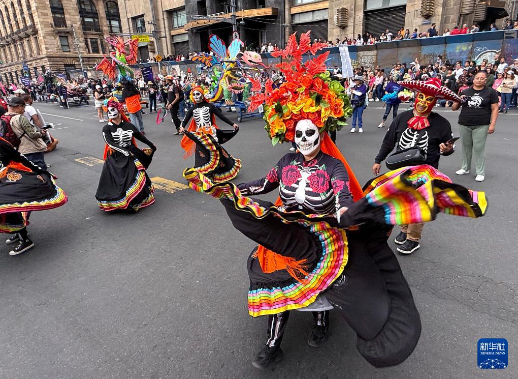 10月18日,在墨西哥首都墨西哥城,身着亡灵节服饰的舞者参加魔幻动物大游行(手机照片)。
