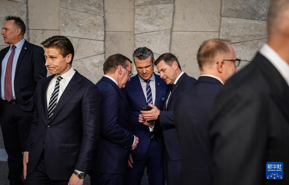 10月15日,在比利时布鲁塞尔举行的北约防长会议结束后,美国国防部长赫格塞思(中)与爱沙尼亚国防部长佩夫库尔(右三)、德国国防部长皮斯托里乌斯(左三)交谈。
