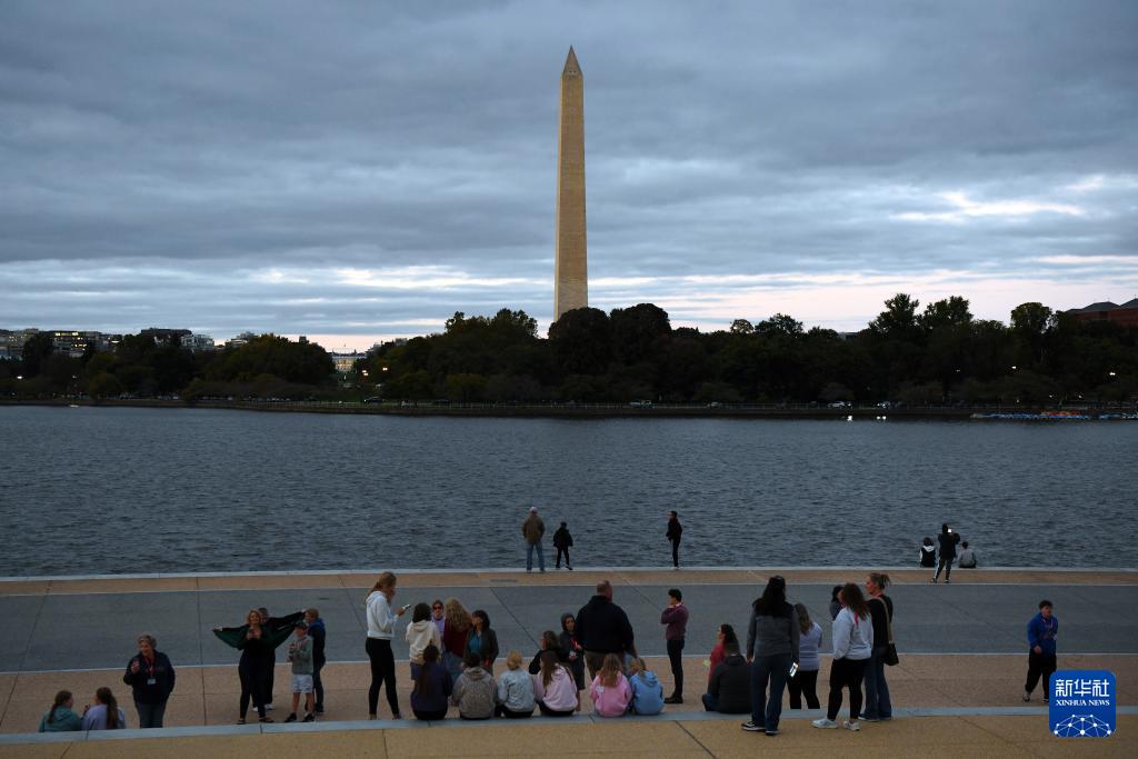 这是10月14日在美国华盛顿杰斐逊纪念堂前拍摄的华盛顿纪念碑。