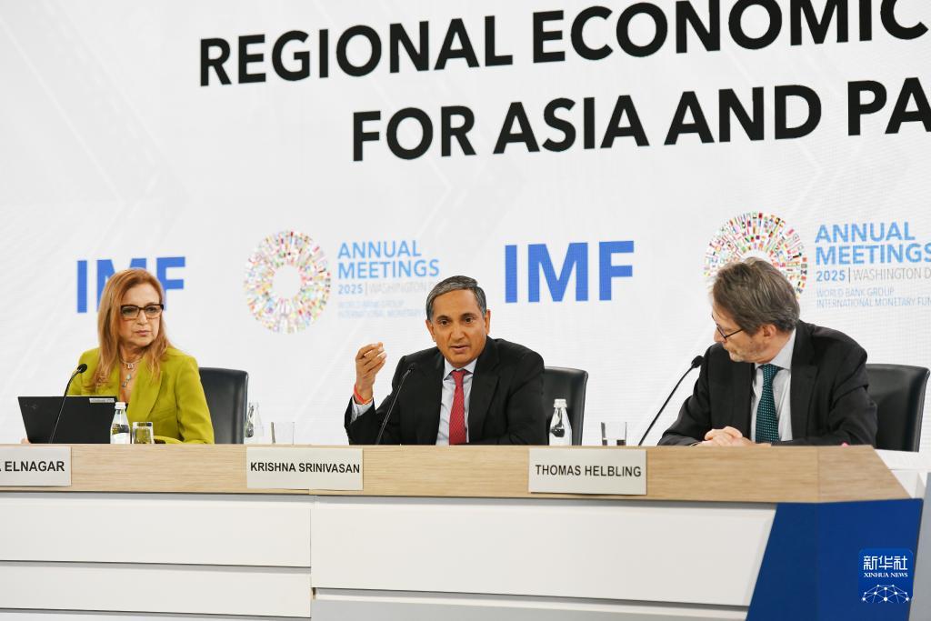 10月16日,在美国华盛顿,国际货币基金组织(IMF)亚太部主任斯里尼瓦桑(中)在新闻发布会上讲话。