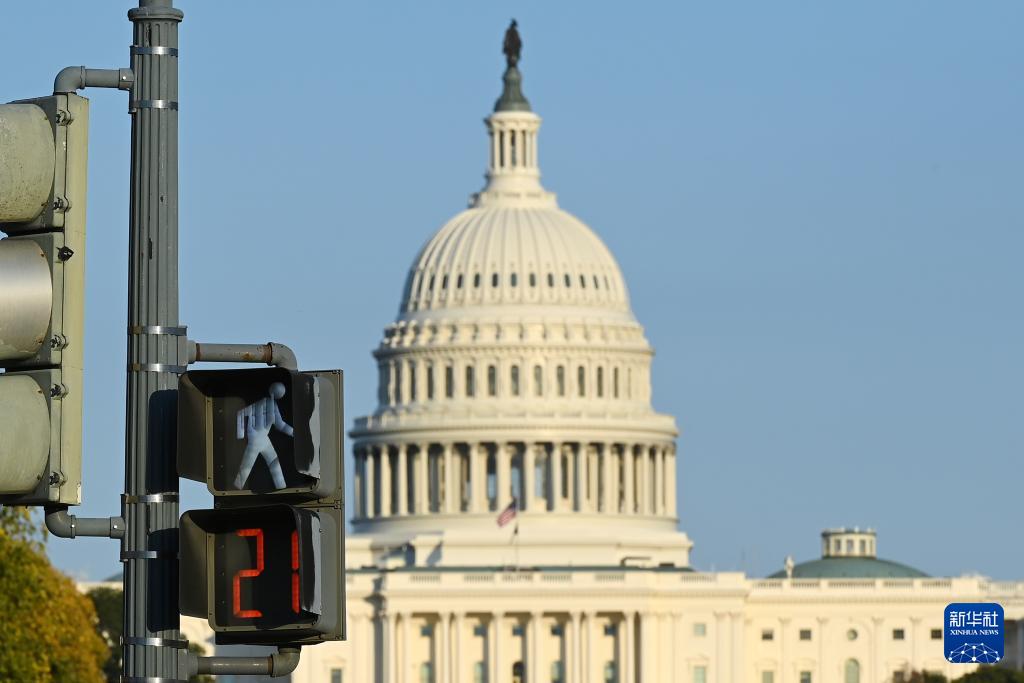 这是10月21日在美国华盛顿拍摄的国会大厦和交通信号灯。