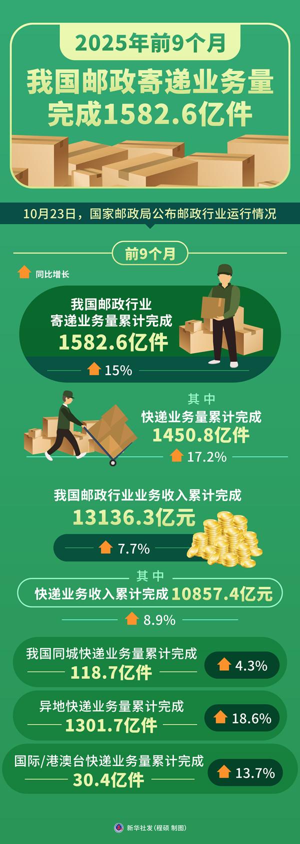 新华社北京10月23日电(记者叶昊鸣)记者23日从国家邮政局获悉,前9个月,我国邮政行业寄递业务量累计完成1582.6亿件,同比增长15%。其中,快递业务量累计完成1450.8亿件,同比增长17.2%。