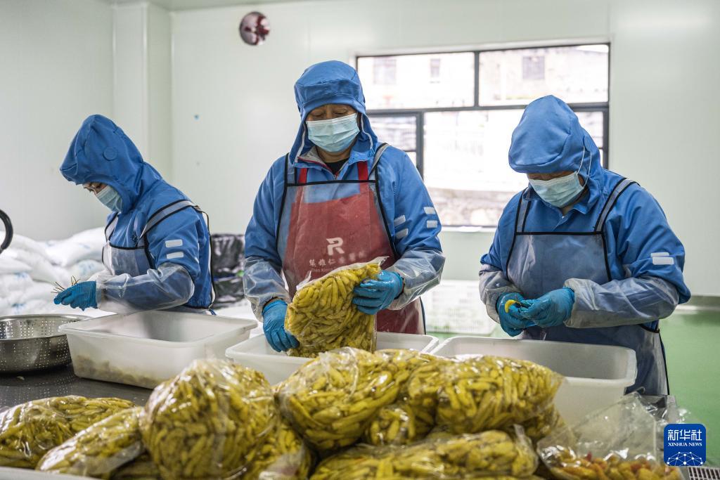 10月23日,工人在云南省昭通市镇雄县五德镇的赤水源绿色食品加工产业园竹笋生产车间内分装腌料。