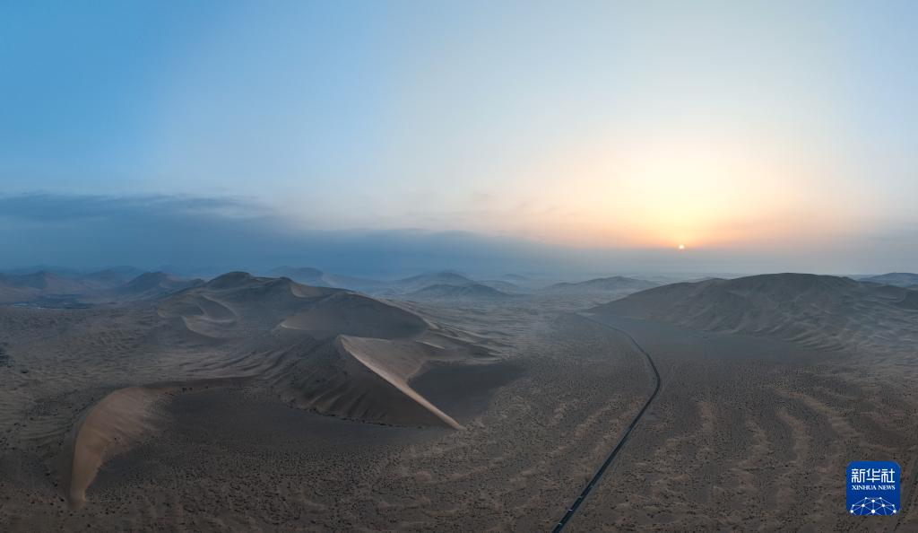 10月22日拍摄的巴丹吉林沙漠日出风光(无人机照片)。