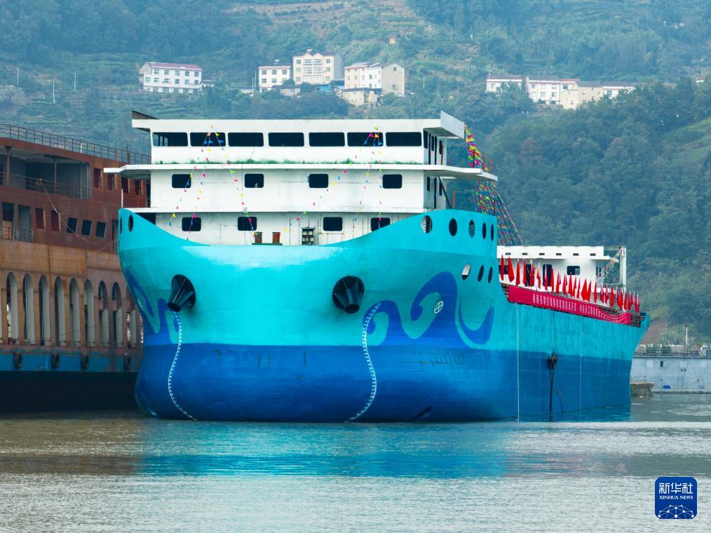 万吨级纯电动散货船在湖北宜昌下水舾装
