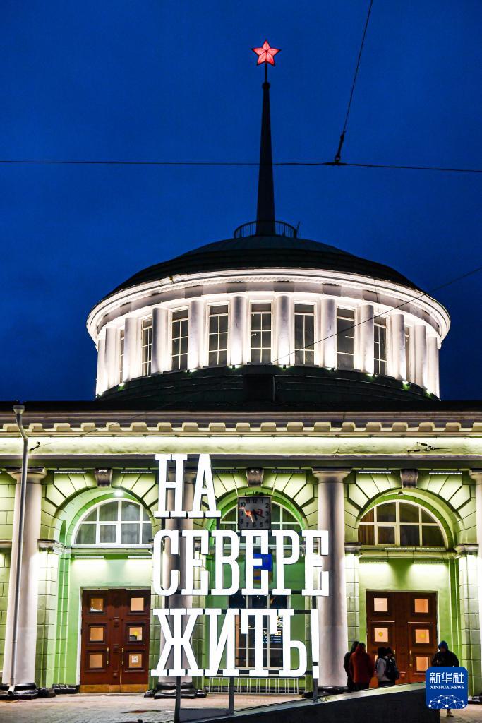 这是10月24日在俄罗斯摩尔曼斯克市拍摄的街景。图中建筑上装饰有摩尔曼斯克市市徽、“英雄城市”等标志性图案。