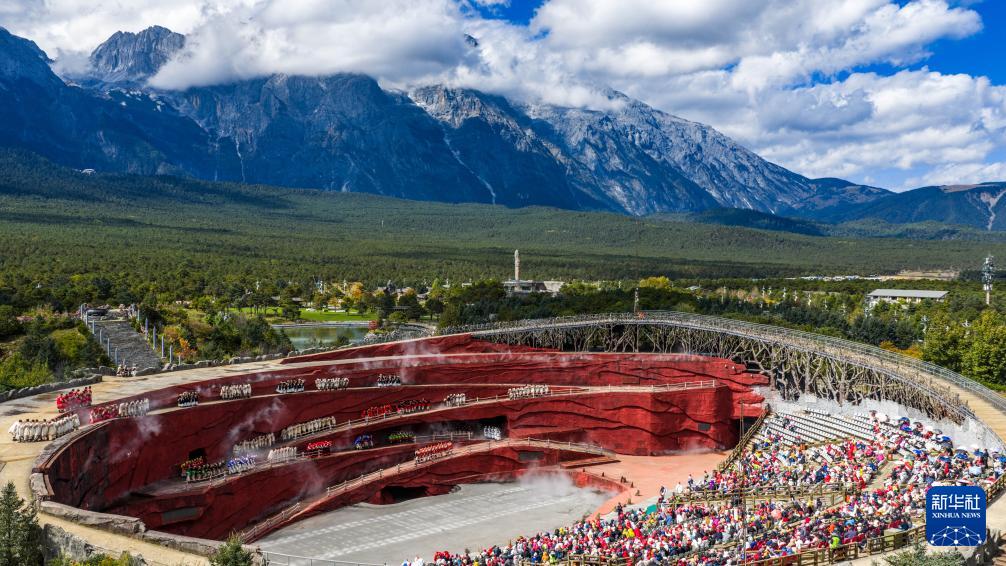 10月26日,游客在丽江市玉龙雪山景区观看《印象丽江》演出(无人机照片)。
