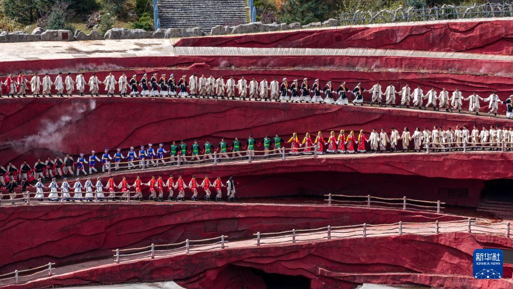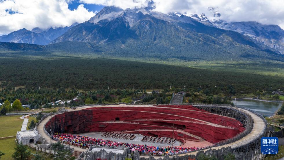10月26日,游客在丽江市玉龙雪山景区观看《印象丽江》演出(无人机照片)。