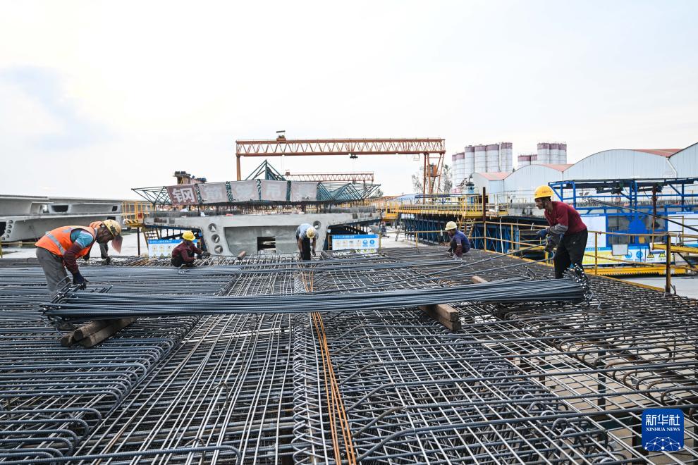 10月27日拍摄的中铁十一局沪渝蓉高铁沪宁段搬经制梁场作业现场(无人机照片)。