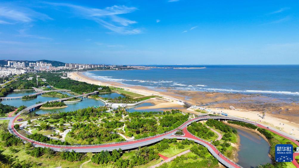 10月22日拍摄的山东日照张北湾阳光海岸绿道及海湾景色(无人机照片)。